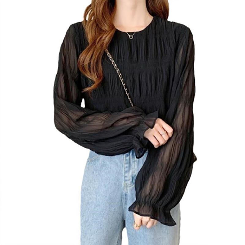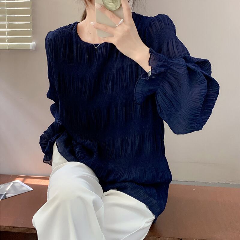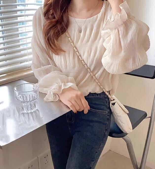 ・袖のシアー感と、くしゅっとしたギャザー感がフェミニンなシャーリングブラウス。